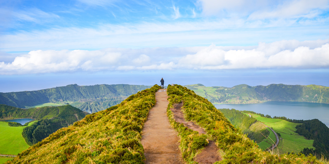 Vi börjar vår resa på Azorerna med en vandring uppe på kraterkanten runt en stor vulkan och ser ner på tvillingsjöarna. En blå och en grön som ligger där liksom vilande i den gröna världen omkring oss. Grönt och blått inga andra färger finns det, förutom alla de svartvita kor som befolkar de här öarna. Efter vandringen äter vi en lunch nere i den lilla byn i mitten av grytan innan vi återvänder till huvudstaden Ponta Delgada via den vilda, västra kusten av ön. Också här ska vi bo i två nätter alldeles i hamnen av denna gamla sjöfararstad mitt i havet.