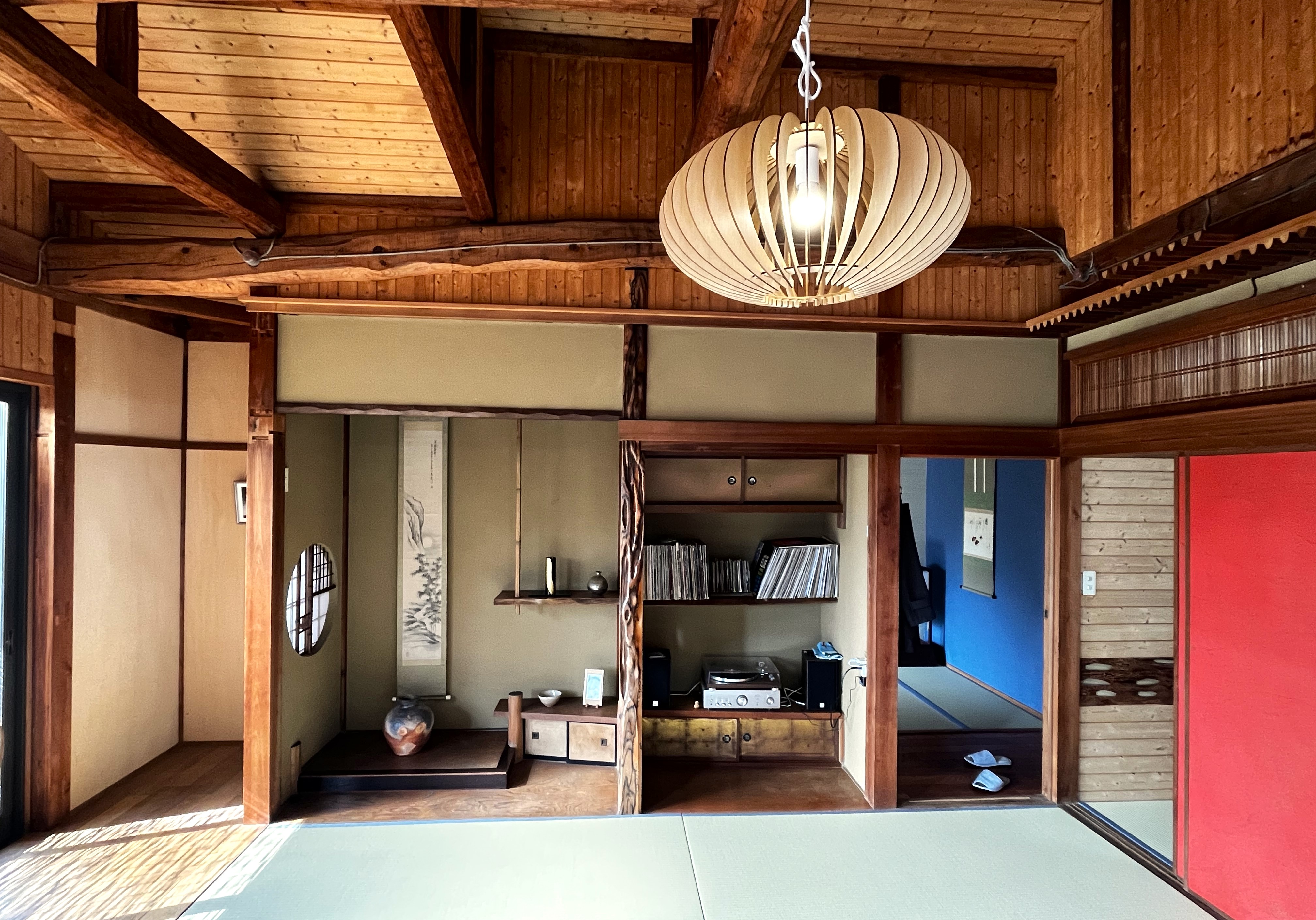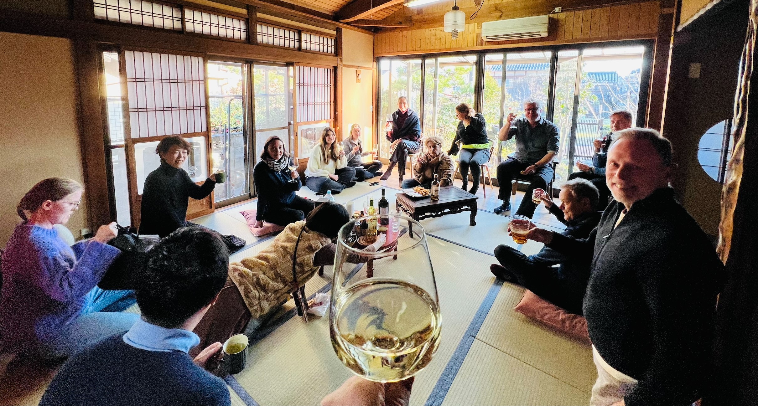 Jag ser naturligtvis till att även blanda in mitt närområde med besök på en lokal izakaya-restaurang i Sakamoto en av kvällarna, en festival i en närbelägen shintohelgedom samt att vi går till de heta källorna som ligger vid Biwasjön inte långt ifrån mitt hus. Här får vi välja bland ett tiotal olika bad, varav flera utomhus, och det går till och med att kika ut över Biwasjön medan vi ligger i ett av dessa bad. En kväll bjuder jag också hem till mig. När jag skaffade ett hus i Japan var det viktigt för mig att huset skulle vara ett riktigt traditionellt hus med gott om tatami-mattor, spännande träinslag och en trädgård som omger huset. Ett rum att spisa jazz i, hemma hos Jörgen
