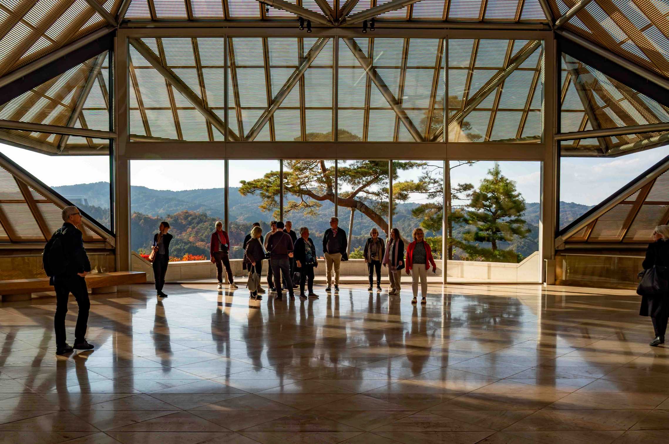 Osaka, Nara och Kobe är alla på korta tågavstånd från Kyoto och går utmärkt att besöka som en dagsutflykt. På resorna Jörgens Kyoto har jag gjort olika program för resorna i april och november. Jag har inte blandat in någon av ovannämnda städer än, men däremot har jag lagt in några besök i grannlänet Shiga med besök vid de fantastiska museerna MIHO och Sagawa samt besök vid någon av de trevliga handelsstäderna Omi Hachiman eller Nagahama vid Biwasjön. Gruppen i november på museet MIHO, ritat av I M Pei