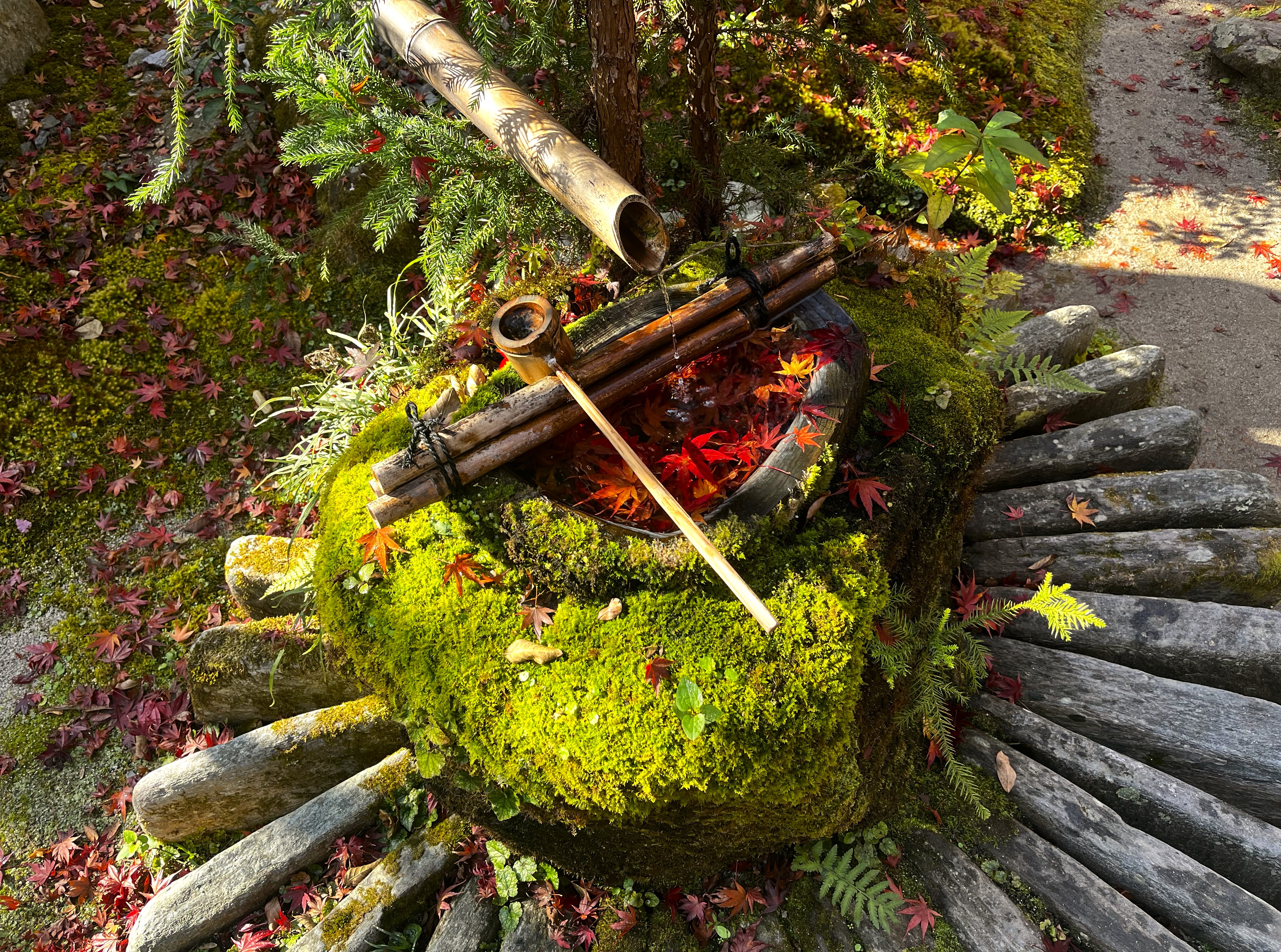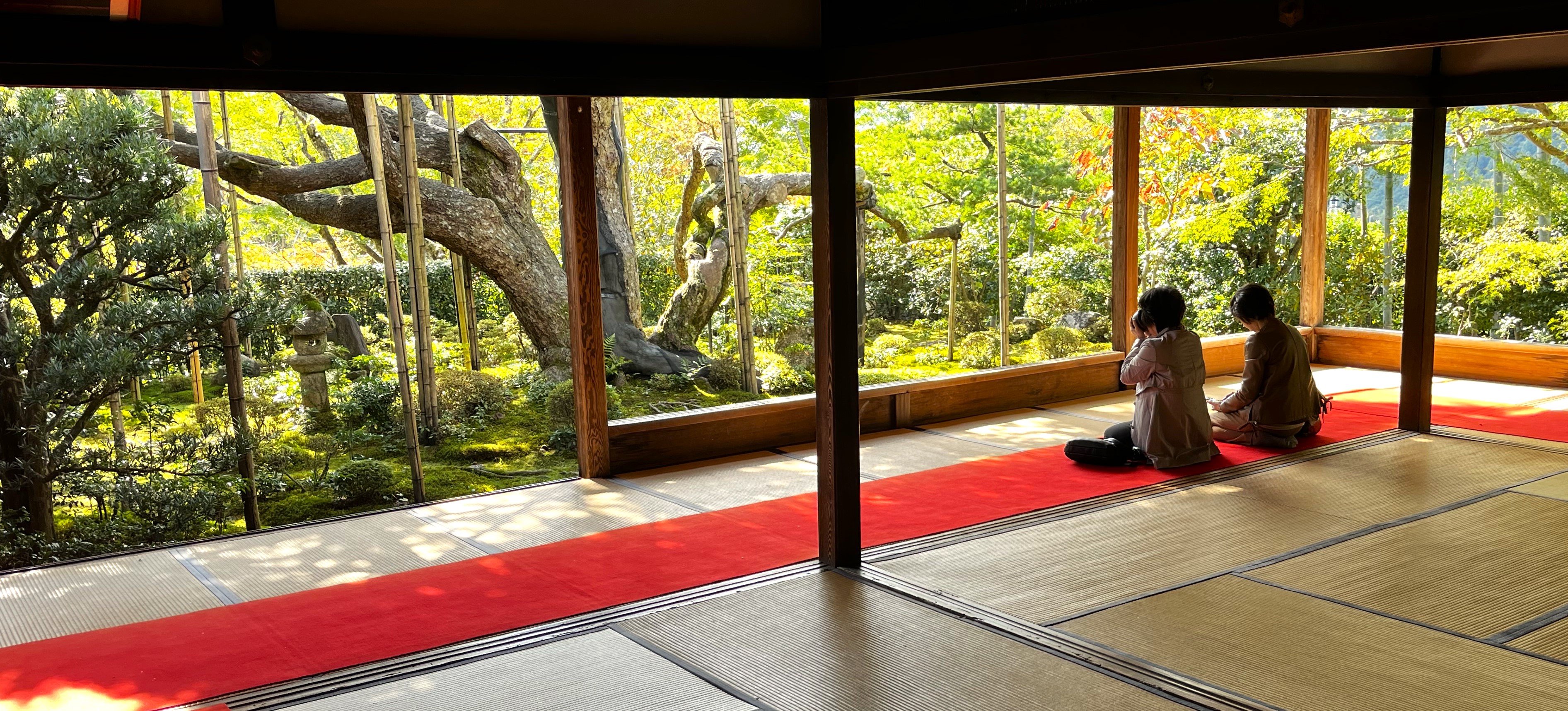 Det är verkligen en fröjd att få besöka de sparsmakade och återhållsamma trädgårdarna och kunna njuta av dem i den stillhet de förtjänar. Jag älskar att besöka trädgårdar som Hosen-In eller Shisen-do i nordöstra Kyoto eller Chikurin-ji i mitt eget område Sakamoto. Till och med ett världsarv som Daigo-ji ser få besökare då templet med dess trädgård inte finns med bland de som det skrivs mest om. Lönnlöv i den mossklädda brunnen, Hosen-In