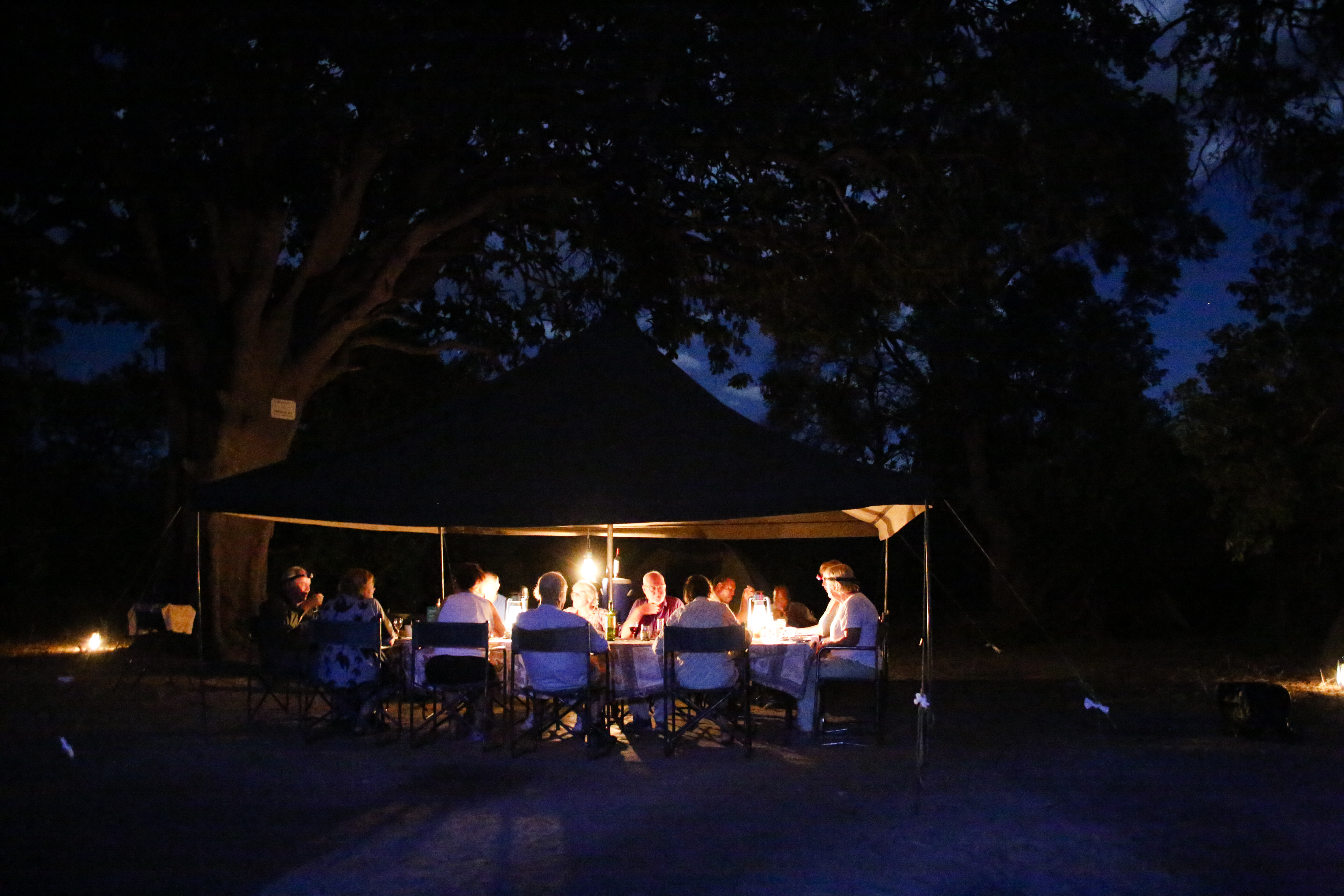 Att tälta i Okavangodeltat är en unik naturupplevelse. Vi vaknar tidigt, tar en kopp kaffe i gryningen innan vi ger oss ut på dagens första safari. Här strövar fortfarande alla vilda djur helt fritt mellan Botswana och Zimbabwe och våra dagar i Moremi Game Reserve bjuder på riktigt nära möten med vilda djur. När vi kommer fram till vårt läger har tälten redan rests med bäddade tältsängar. I lägret finns även en enkel dusch och toalett. På kvällen samlas vi under stjärnhimlen vid dukat bord med levande ljus och delar dagens händelser med varandra - en svårslagen upplevelse.