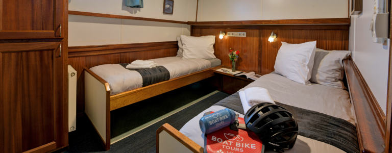 - Del i 2-bäddshytt med två enkelsängar på chartrad kanalbåt i 7 nätter. Privat dusch och toalett i varje hytt som är utrustade med handdukar, hårtork, Wi-Fi, luftkonditionering, interntelefon och säkerhetsbox. OBS! På båten finns det ej enkelrum, utan endast del i 2-bäddshytt.