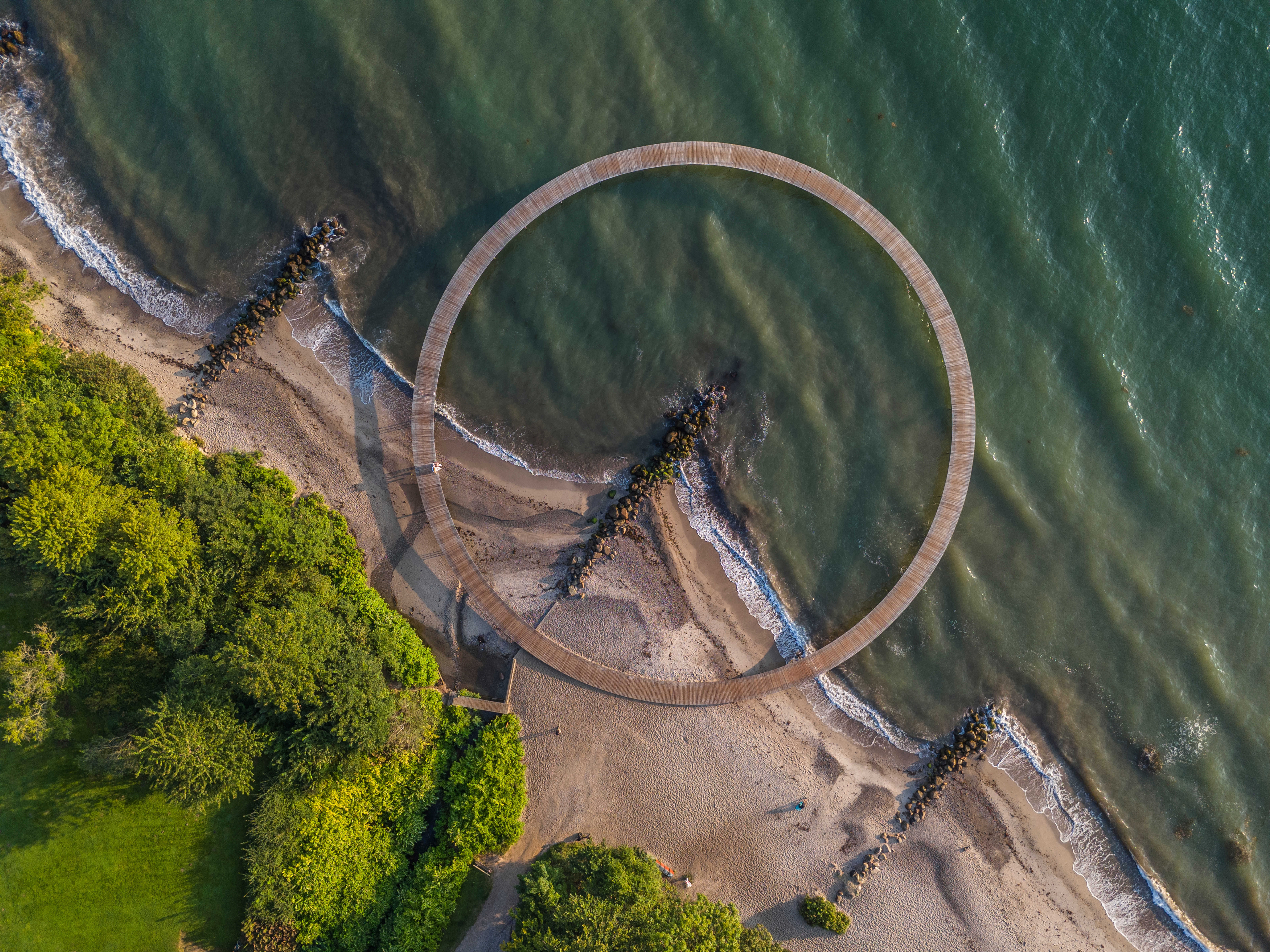 Nu tar vi bussen mot ännu en plats där cirkelformen står i centrum, denna gång i mindre skala. Vid stranden intill Marselisborg slot hittar vi Infinite Bridge, en oändlig bro, eller kanske snarare en pir, skapad av Niels Povlsgaard och Johan Gjødes. Slottet är danska drottningens sommarresidens, och om kungafamiljen inte planerat att vara där just när vi kommer på besök, får vi möjlighet att strosa runt i den vackra skulpturparken som ligger omgiven av lövskog och havsutsikt.