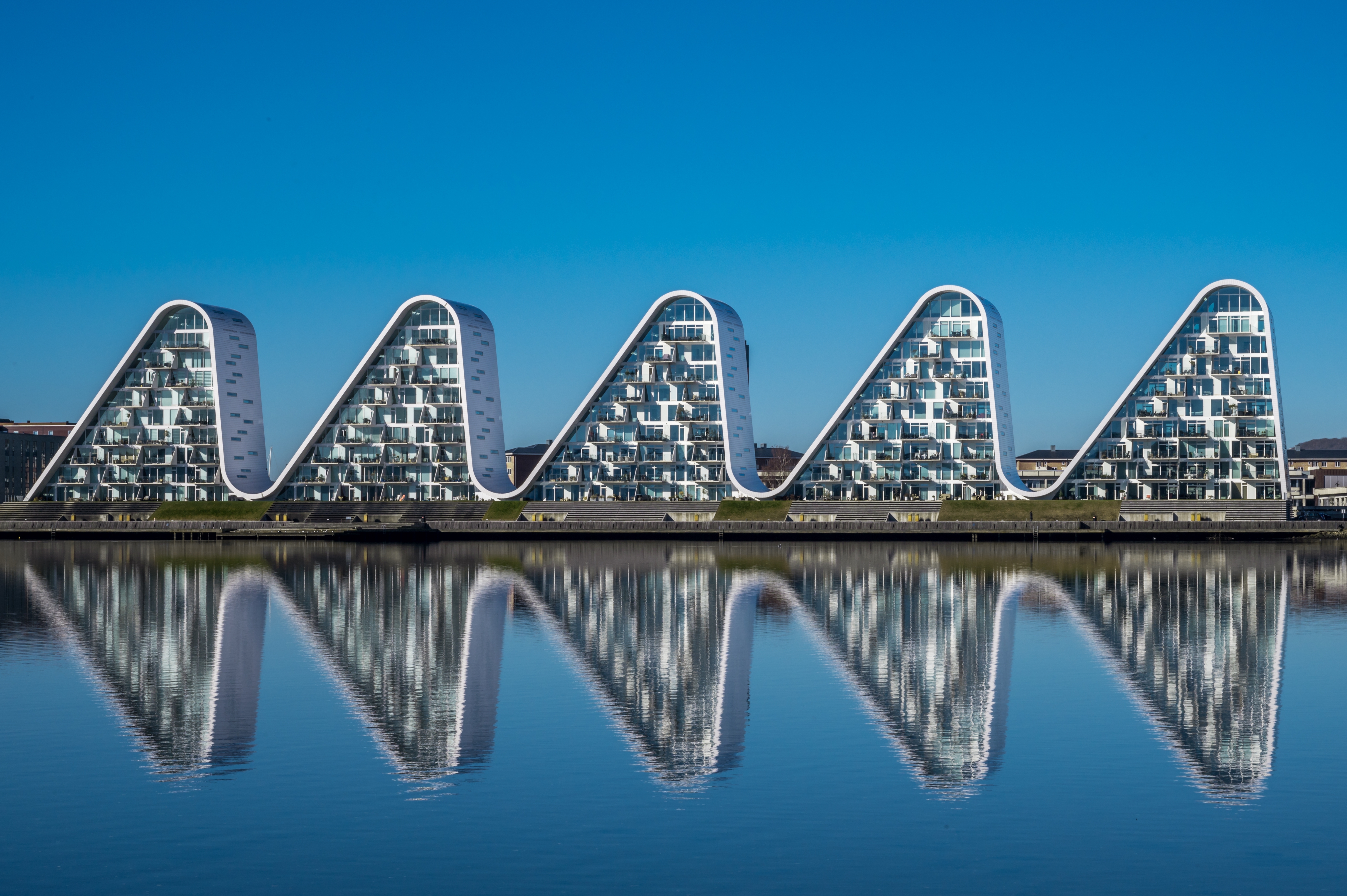 Vi intar gemensam lunch med utsikt över häftiga bostadskomplexet Bølgen, eller The wave. Det är Henning Larsen arkitekter som står bakom den flerfaldigt prisbelönta byggnaden som bland annat inspirerats av kullarna som omger Vejle. Vi promenerar sedan förbi flytande terasser och kajakklubbar över till dansk-isländske Olafur Eliassens unika Fjordenhus.