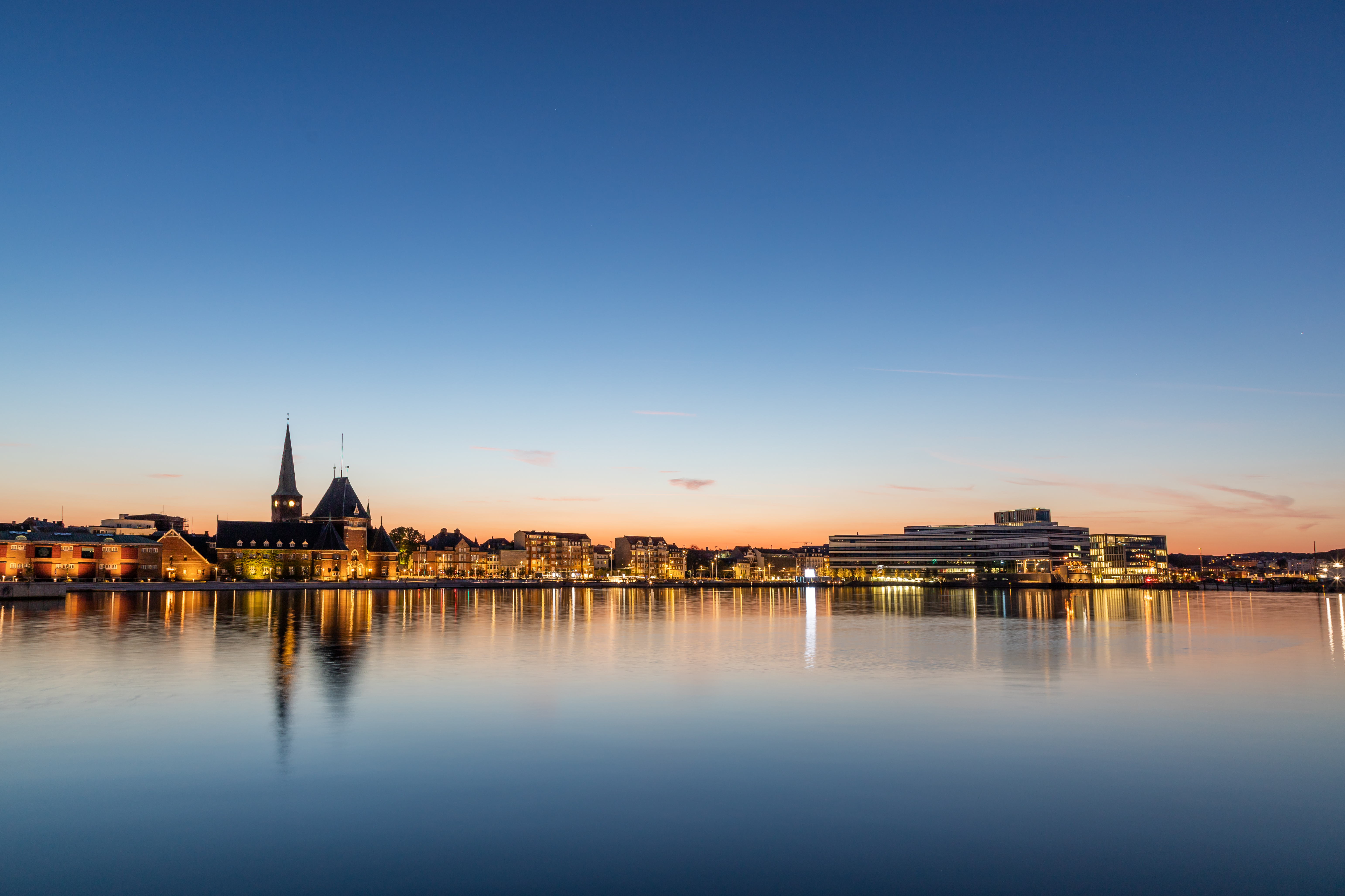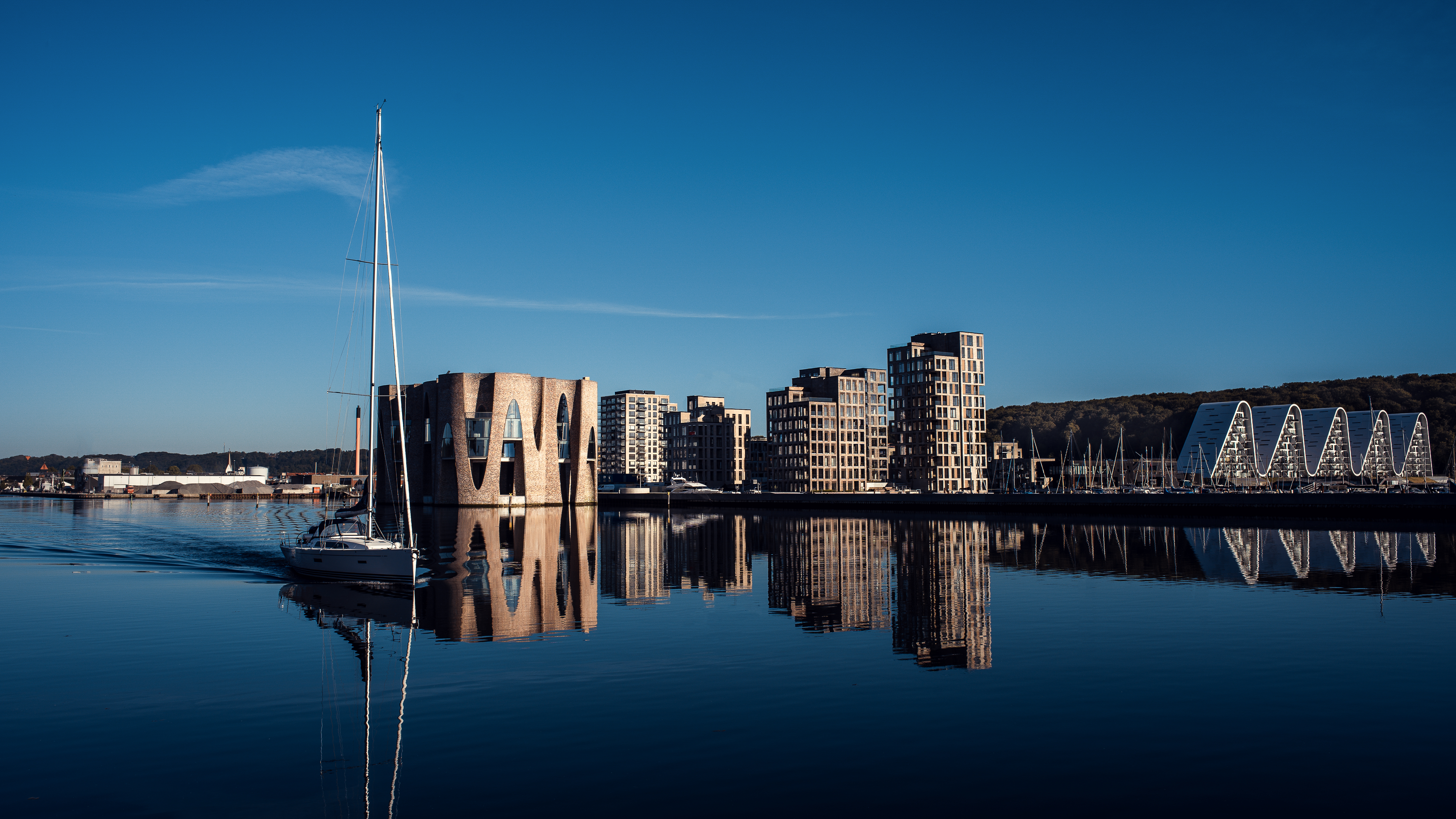 Efter att ha checkat in på vårt hotell beger vi oss ned till hamnen där vi ska beundra två ikoniska byggnader. Musikkens hus är resultatet av en dröm om att sätta Nordjylland på den kulturella kartan och efter man slog upp dörrarna 2014 har succén varit ett faktum. Den lekfulla och skulpturala byggnaden är ritad av österrikiska COOP Himmelb(l)au och är hemmascen för stadens symfoniorkester, DanskJazzCenter och ett antal musikutbildningar.