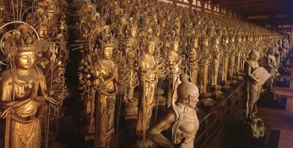 Allt vaktas av 28 uråldriga indiska gudar i form av trästatyer framför de 1000 gyllene buddhorna, sammanlagt en otroligt mäktig och märklig syn. Templet är också känt för sina bågskyttetävlingar på den långa balkongen på templets baksida.